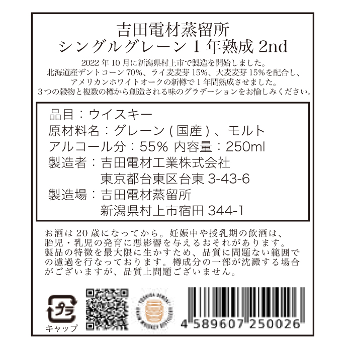 吉田電材蒸留所 グレーンウイスキー1年熟成2nd【よしだでんざいじょうりゅうしょ】 250ml